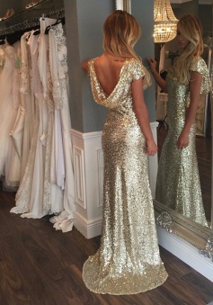Sheath Crew Neck Cap Sleeveless Sweep Train Gold Sequins Prom Dress