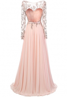 Dramatic A-Line Bateau Long Sheer Sleeves Backless Beading Long Prom Dress with Sash