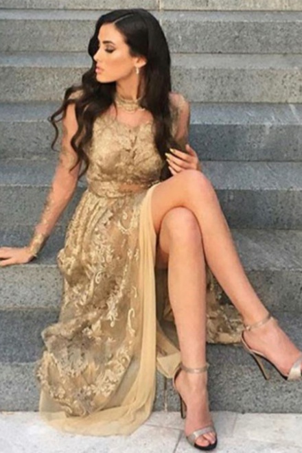 A-Line High Neck Long Sleeves Champagne Tulle Prom Dress with Appliques