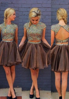 Two Piece V-Neck Cap Sleeves Short Burgundy Lace Homecoming Dress with Beading