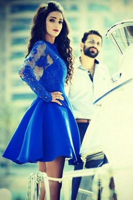 A-Line Jewel Long Sleeves Short Royal Blue Satin Homecoming Dress with Appliques