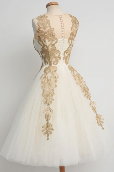 A-Line Jewel Tea-Length Sleeveless Ivory Tulle Homecoming Dress with Appliques