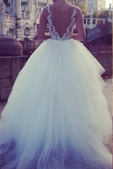 Pure White Princess Ball Gown Wedding Dress Sheer Nude Tulle Bridal Gwons with Pearls TB0310