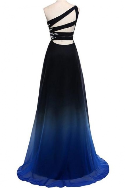 A-line One Shoulder Sweep Train Beading Long Evening Prom Dress