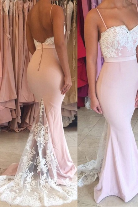 Mermaid Straps Pink Lace Train Long Prom Dress Bridesmaid Dress