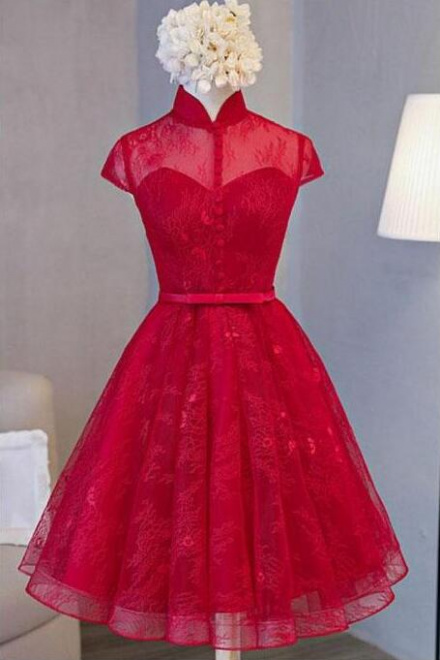 A Line Navy Blue High Neck Short Lace Homecoming Dresses with Cap Sleeve