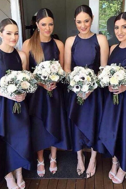 Simple Tea-Length Jewel Sleeveless Navy Blue Tiered Bridesmaid Dress