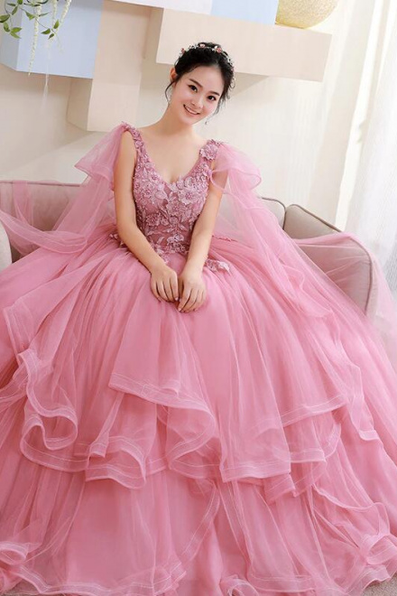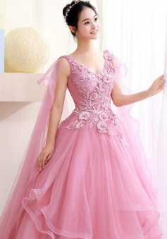 Ball Gown Pink Tulle Party Dress With Lace Applique