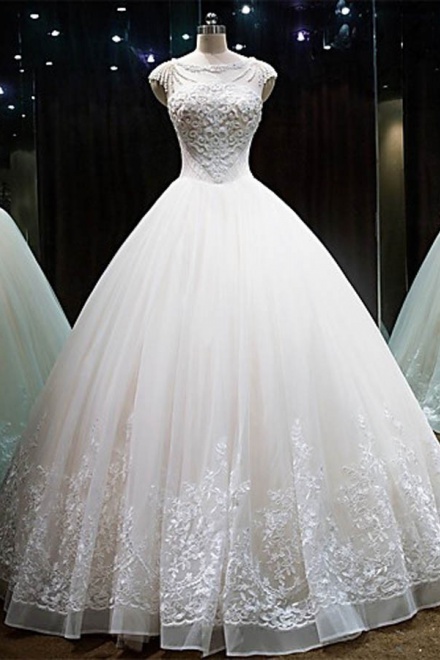 Glamorous Bateau Cap Sleeves Ball Gown Long Organza Wedding Dress with Beading Lace