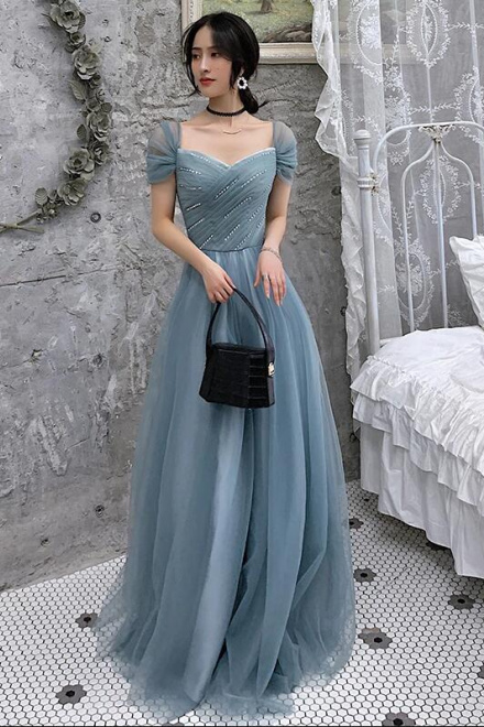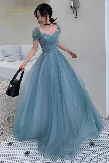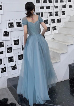 Floor Length A Line Long Tulle Prom Evening Dresses