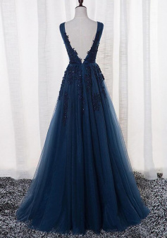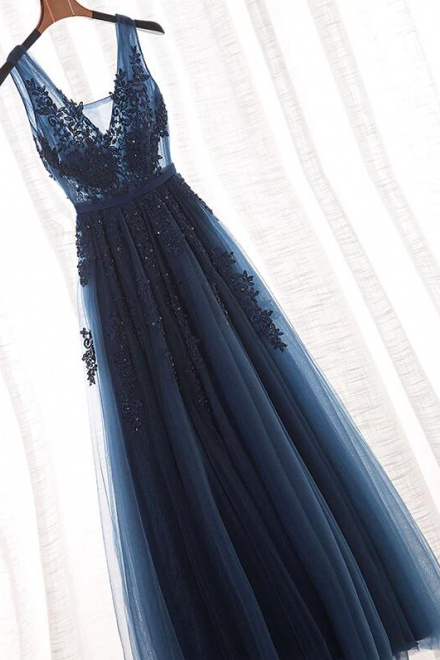 Floor length A-Line V-neck Tulle Prom Dress With Lace Appliques
