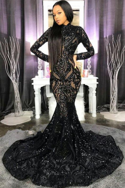Mermaid Long Sleeve High Neck Shiny Black Girl Prom Dresses