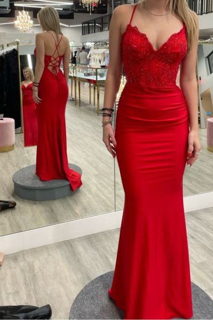 Red Prom Dresses V Neck Long Evening Gown