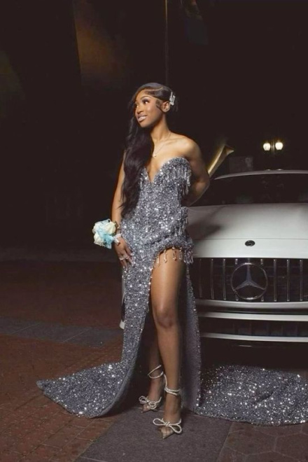 Women Prom Dress Silver Gray Mermaid Sequin Evening Dress