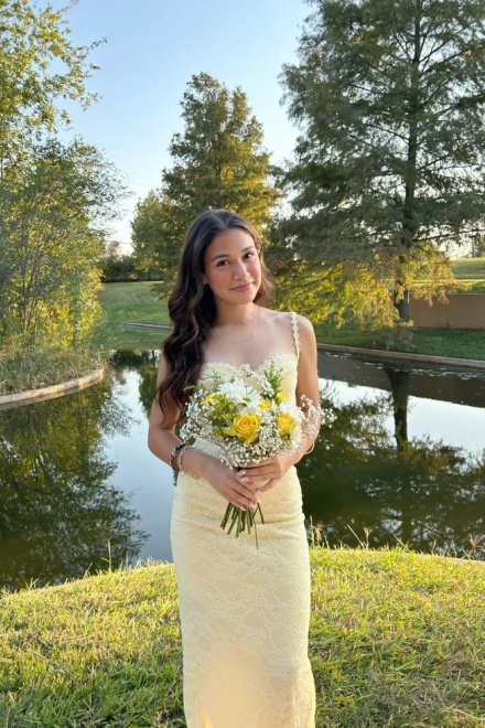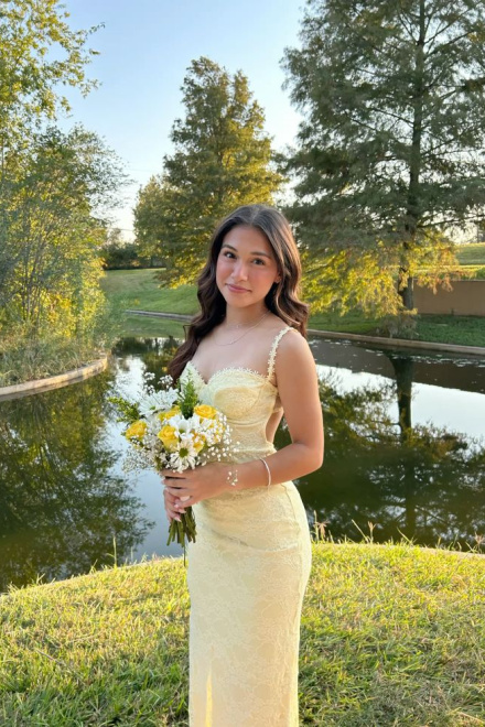 Pastel Yellow Prom Dress, Elegant Lace Evening Dress