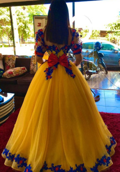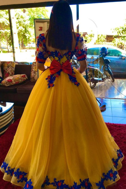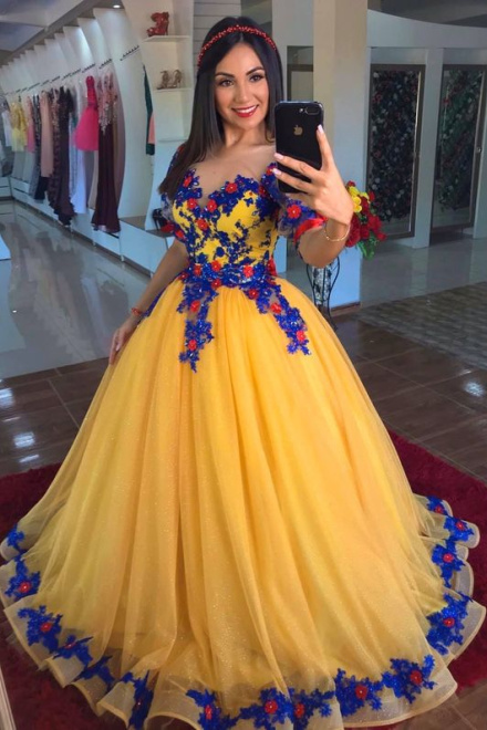 Evening Dresses Yellow Sequins Prom Lace 3d Flower Evening Gowns Short Sleeve Princess Formal Women Dress