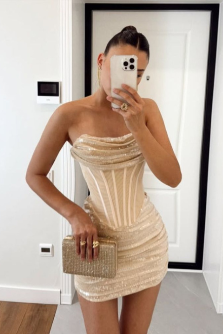 Light Champagne Sheath Strapless Corset Tulle Sequin Short Homecoming Dress Cocktail Dress