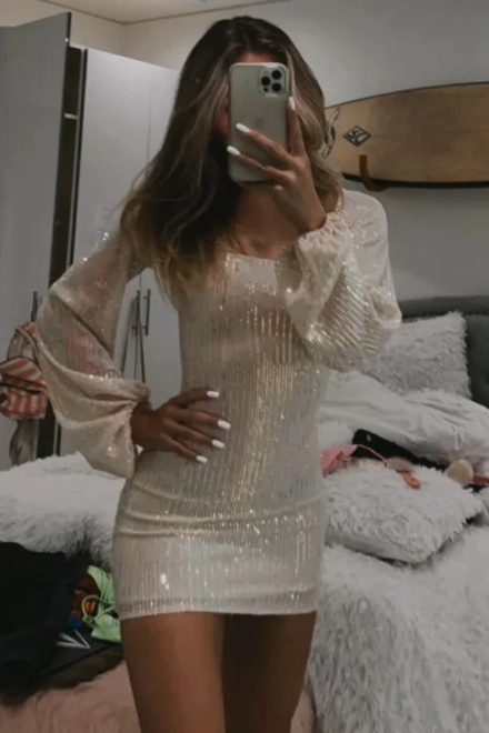 Puff Long Sleeve Mini Party Dress Sequin Homecoming Dress