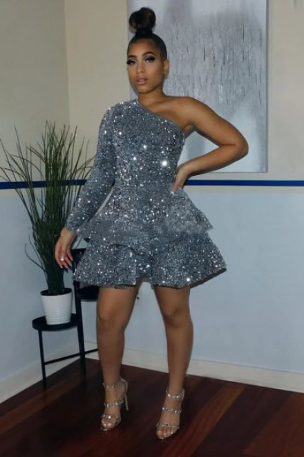 Sparkly Sequin Cocktail Dresses Short A Line One Shoulder African Women Formal Long Sleeve Homecoming Dress