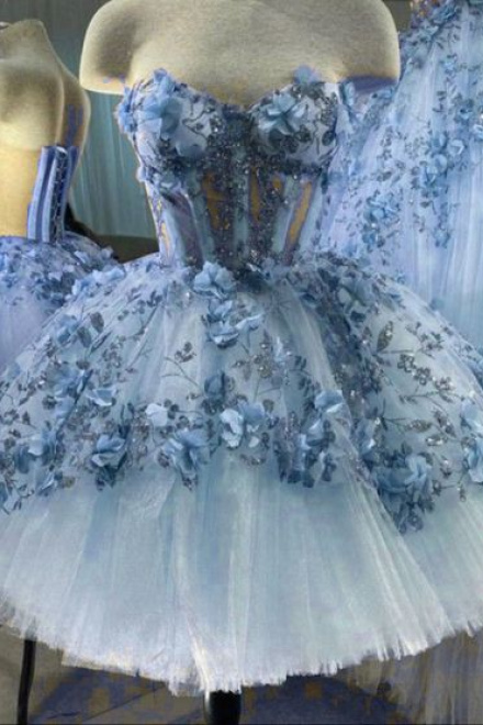 Blue Tulle Short Homecoming Dress With 3D Flowers