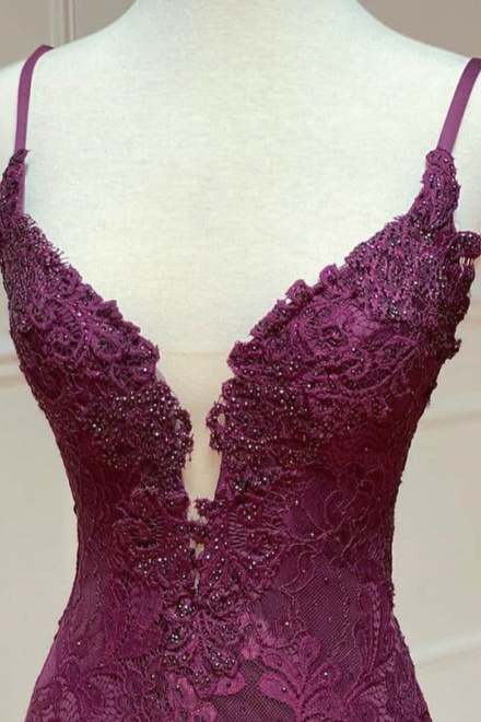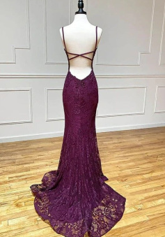mermaid/trumpet spaghetti straps grape lace beaded long prom dress formal evening dress