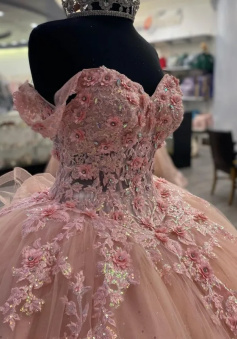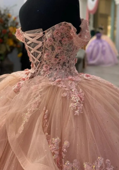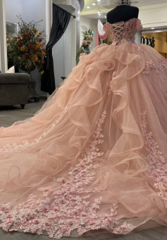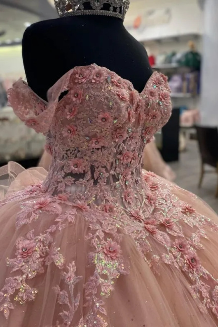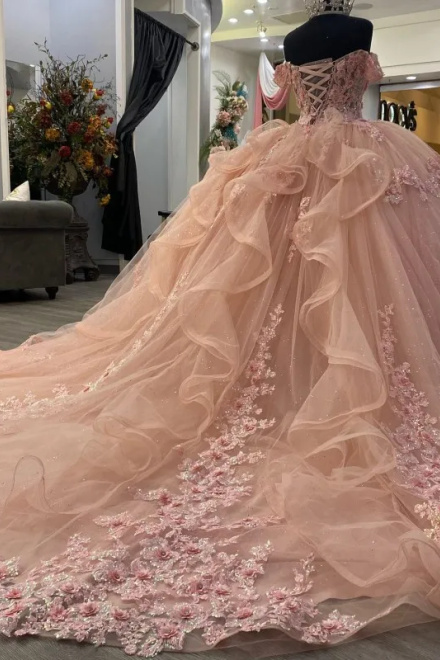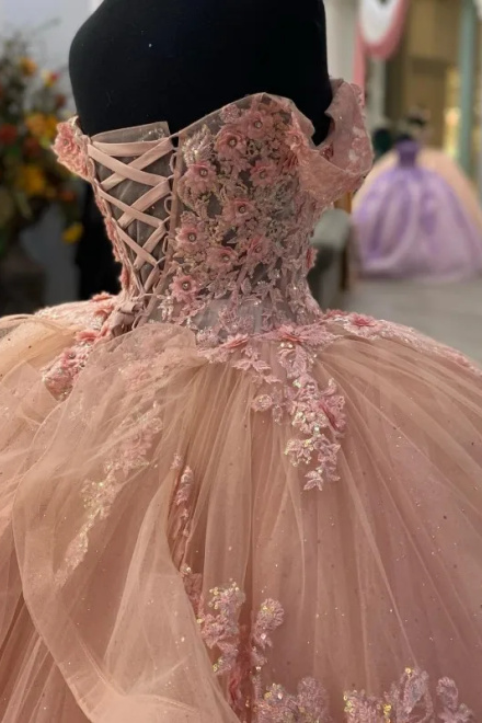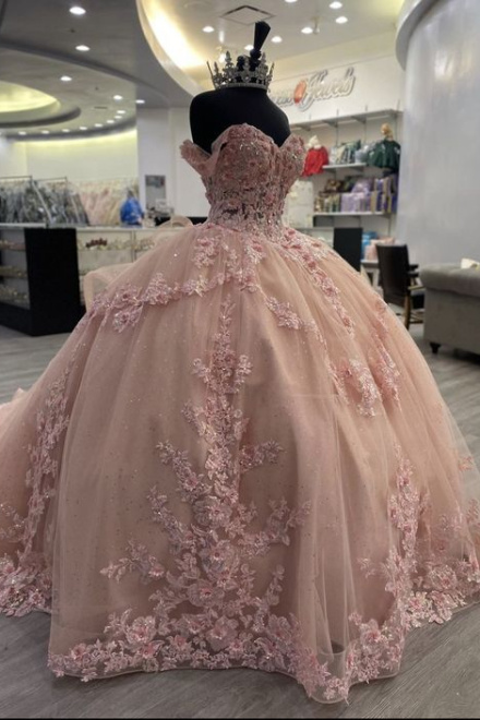 Pink Lace Long Prom Dresses, Ball Gown Sweet 16 Dresses
