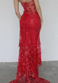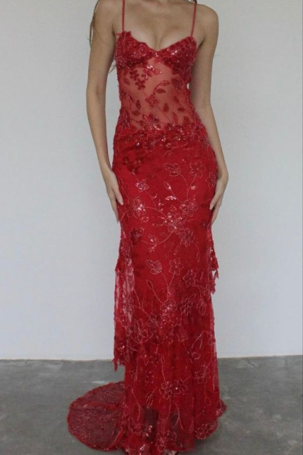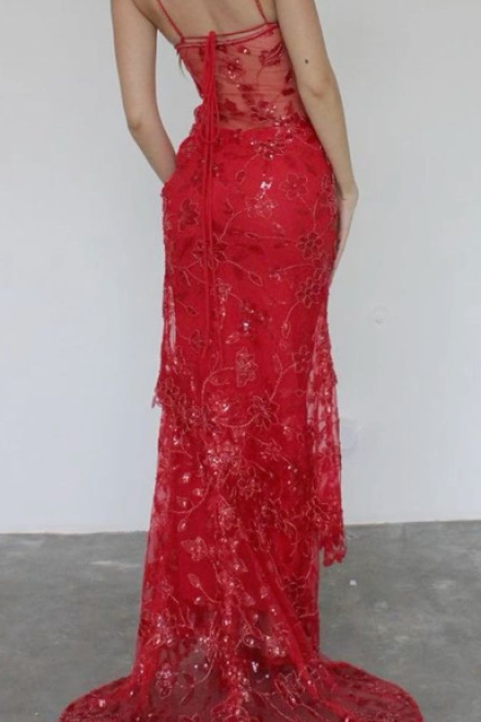 Spaghetti Straps Birthday Party Dresses Red Lace Prom Dresses