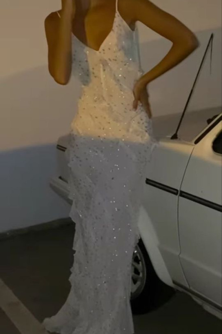 Modest V Neckline White Long Prom Dresses Evening Gown