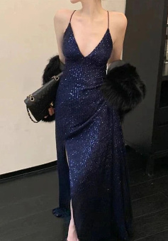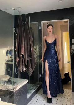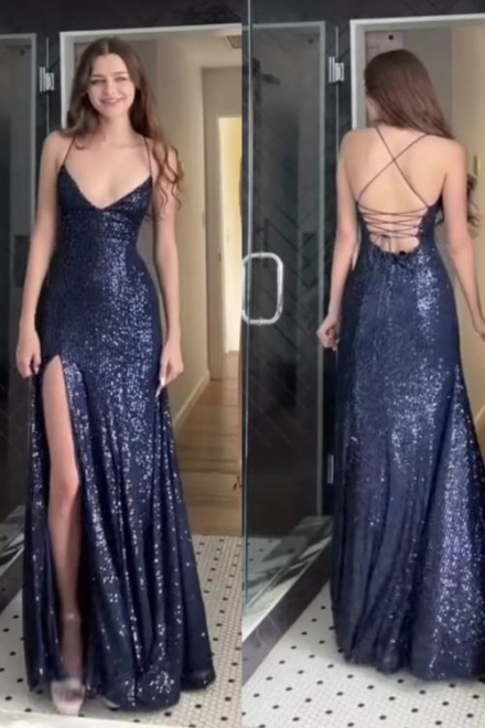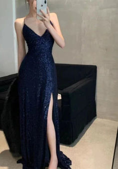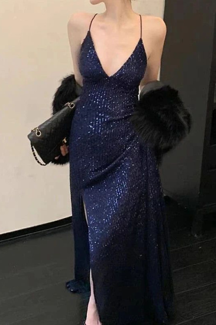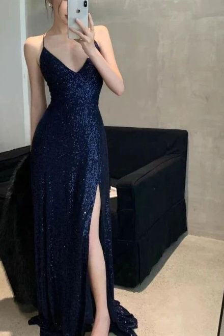 Womens Navy Sequined Slitted Spaghetti Strap V Neck Full-Length Formal Gown Dress
