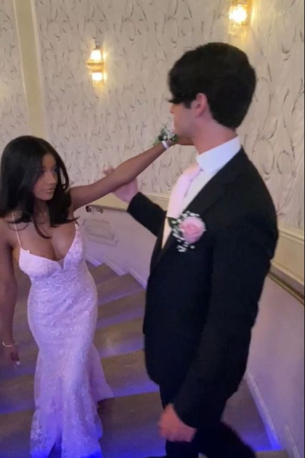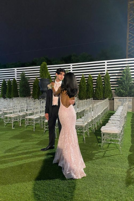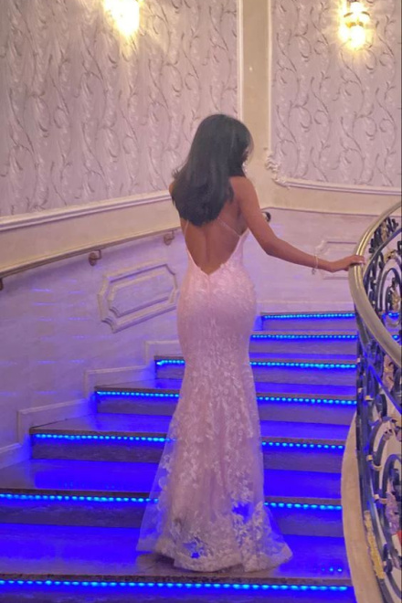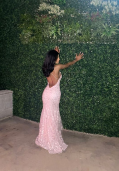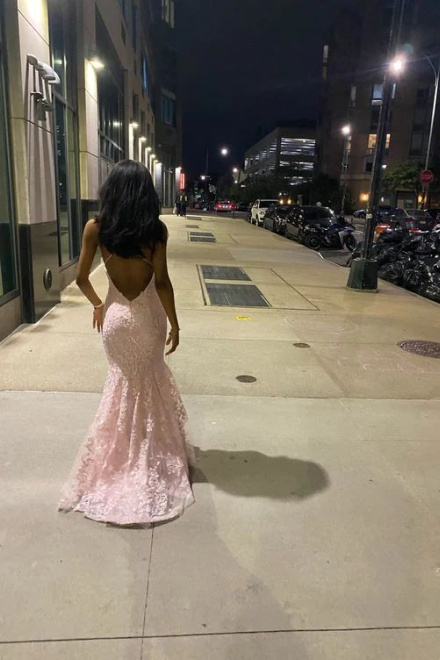 Sexy Mermaid Spaghetti Straps Sleeveless Lace Pink Prom Dress Birthday Outfit