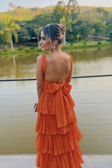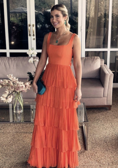 A-line Orange Modest Formal Long Women Evening Prom Dresses