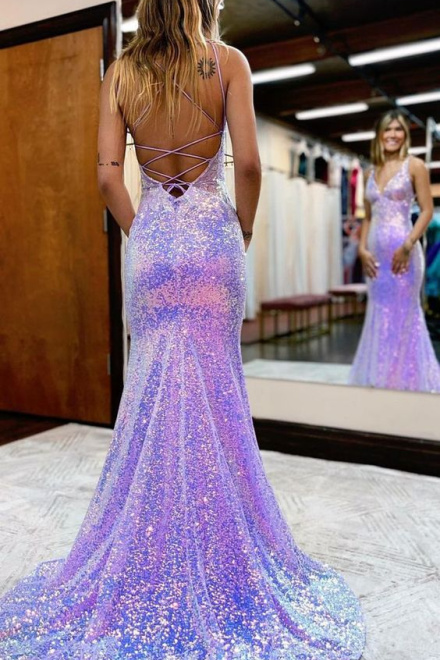 Plunging V-Neck Sequins Sparkly Prom Dress