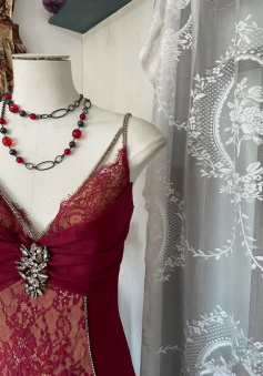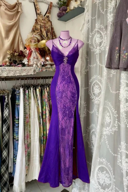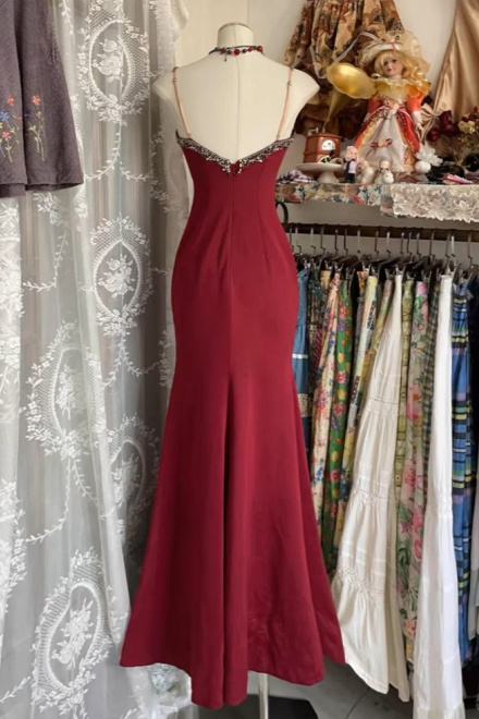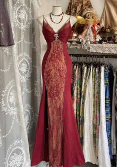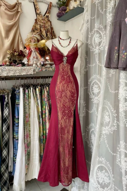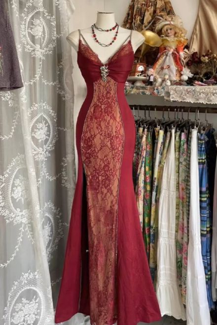 V Neck Lace Burgundy Long Prom Dress Mermaid Evening Party Gown
