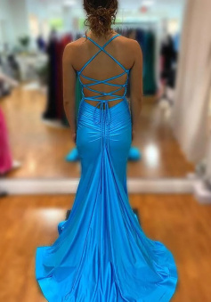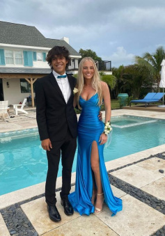 Elegant Blue V Neck Prom Dress With Split,Blue Formal Dress