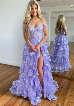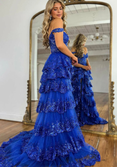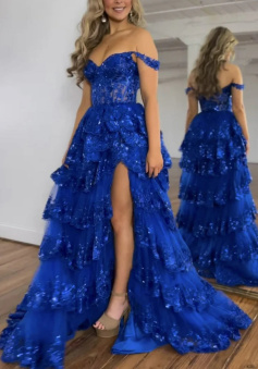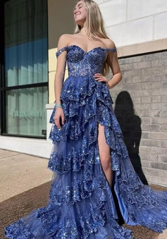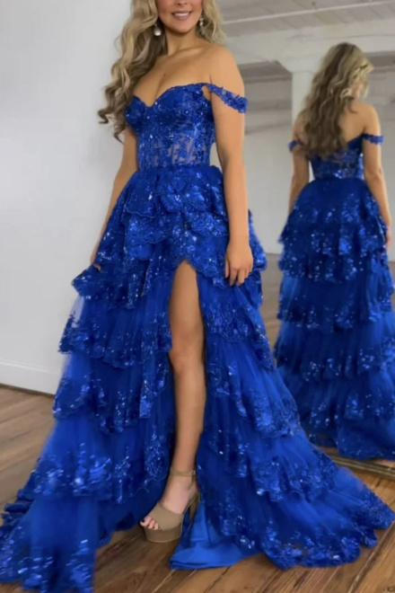 Off Shoulder Layered Navy Blue Lace Long Prom Dress with Split, Off the Shoulder Navy Blue Formal Dress