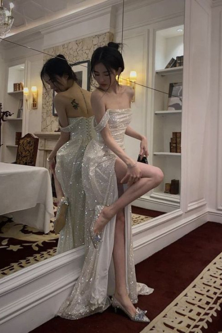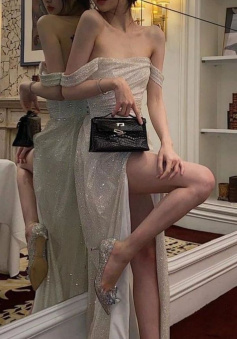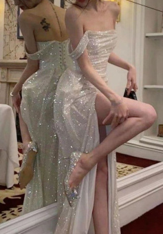 Shinny High Slit Women Formal Evening Party Prom Gowns