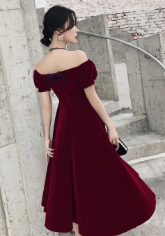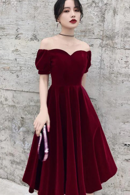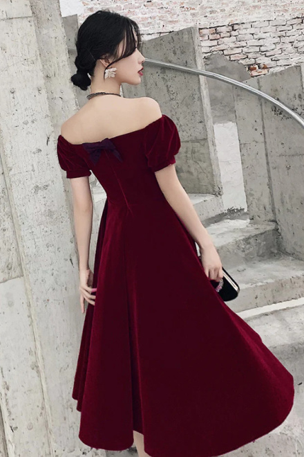 Wine Red Short Velvet Evening Dresses, Off Shoulder Prom Dresses Bridesmaid Dress