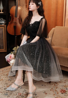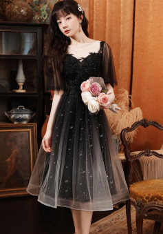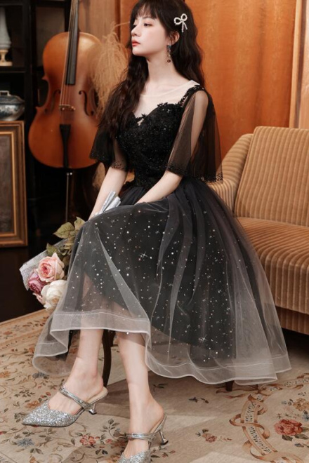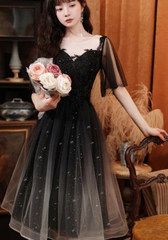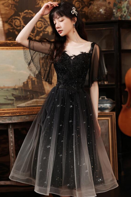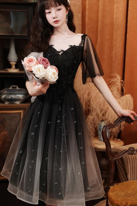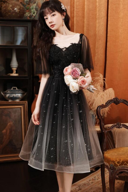 Black Short Sleeves Gradient Tulle And Lace Party Dress, Lovely Black Formal Dresses Bridesmaid Dress