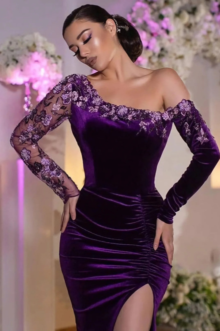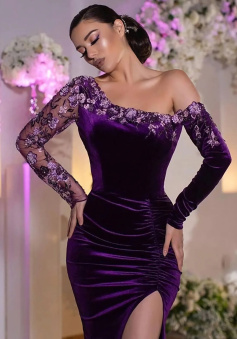 Purple Elegant Velvet One-Shoulder Lace Side-Slit Mermaid Long Bridesmaid Dress Prom Dress