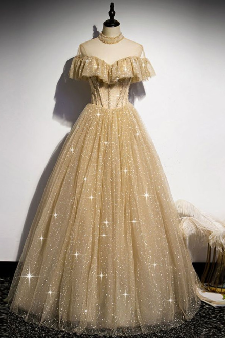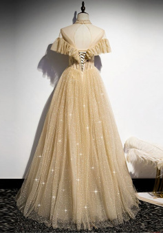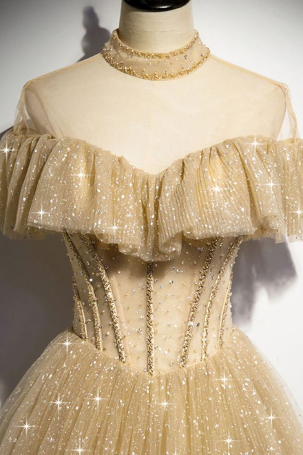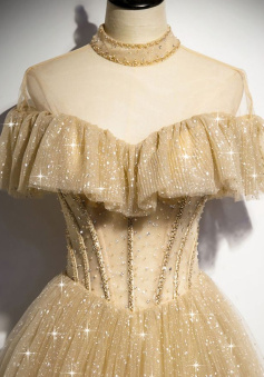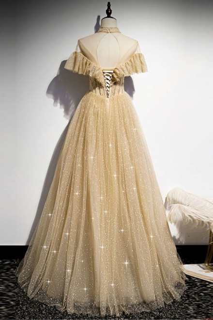 Gold Tulle Sequin Long Prom Dress, Gold Tulle Bridesmaid Dress
