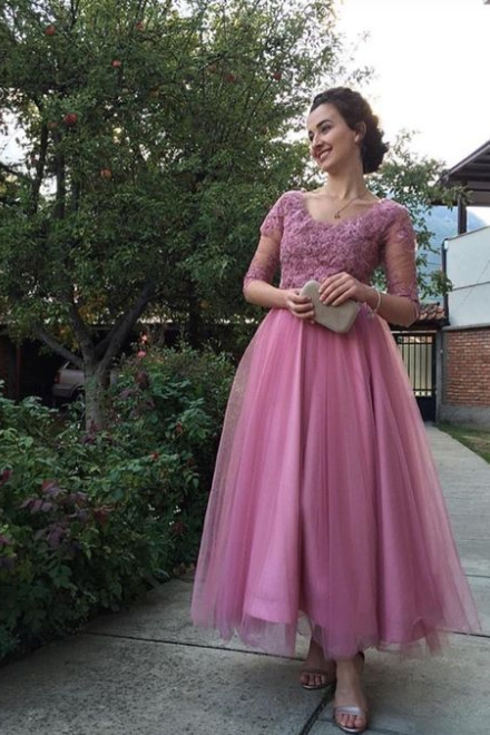 Tulle Lace Prom Dresses Tea Length Bridesmaid Dress Evening Dress