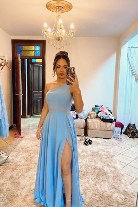 Elegant One Shoulder Blue Prom Dress With Slit,Blue Bridesmaid Dress