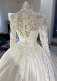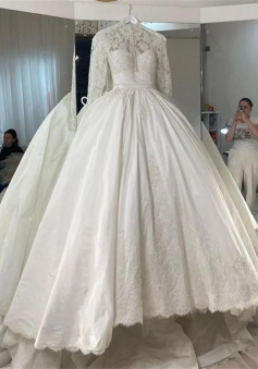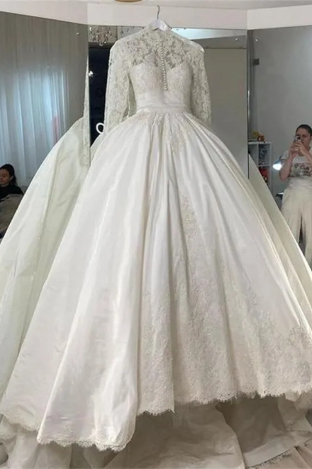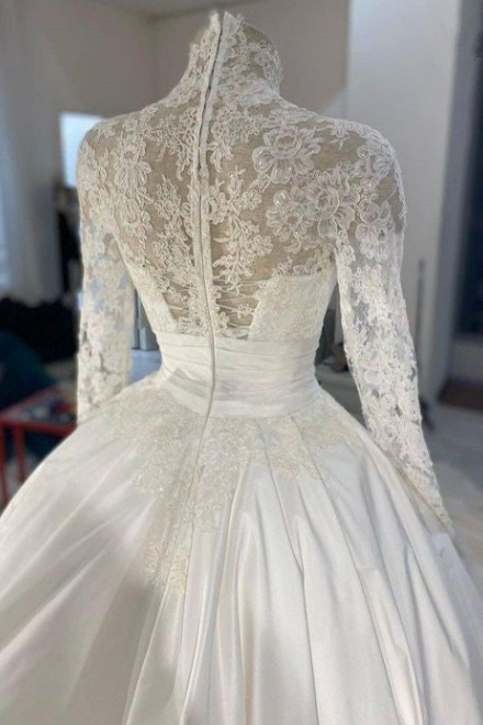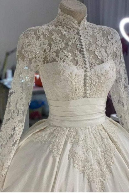 Wedding Dress 3D Flowers Pearls High Neck Lace Dresses Bridal Long Sleeve Ball Gowns For Women Ivory Muslim Engagement Dress