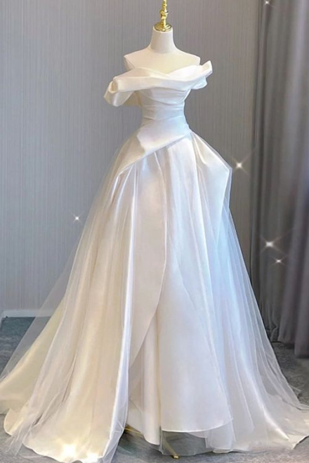 White Satin Tulle Off the Shoulder Pleats Wedding Dress