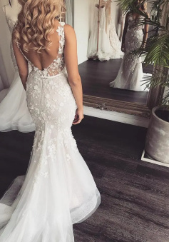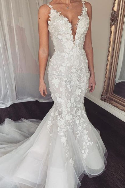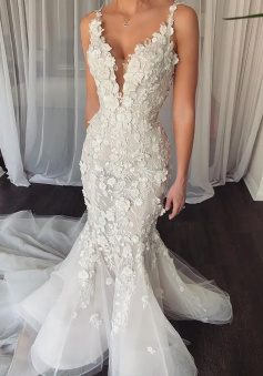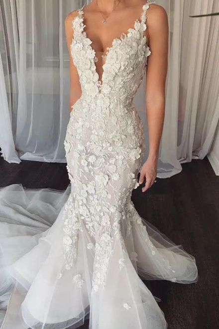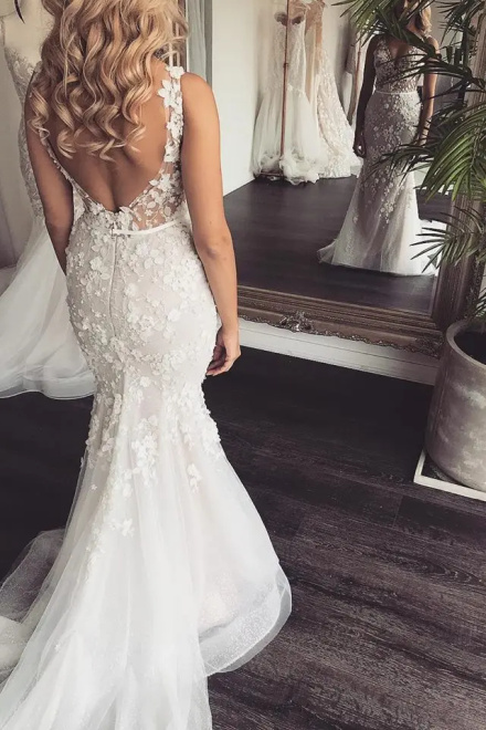 Gorgeous Mermaid Wedding Dresses 3D Floral Appliqued Sweep Train Country Bridal Gowns