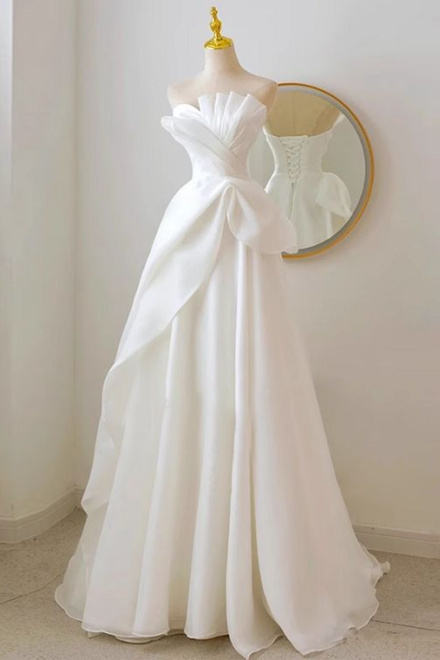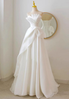 White Strapless Pleats Wedding Dress