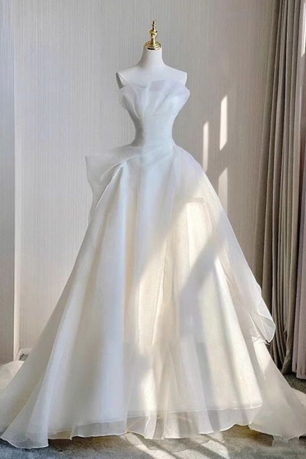 White Organza Strapless Pleats Sleeveless Wedding Dress