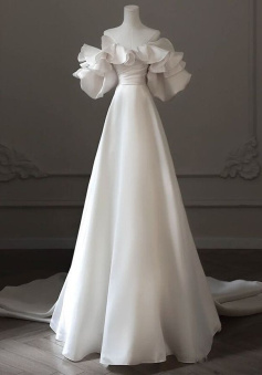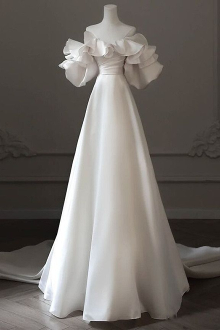 Off the Shoulder Puff Sleeve Pleats Wedding Dress Long Wedding Dress