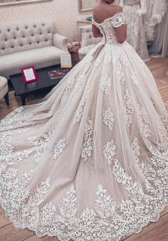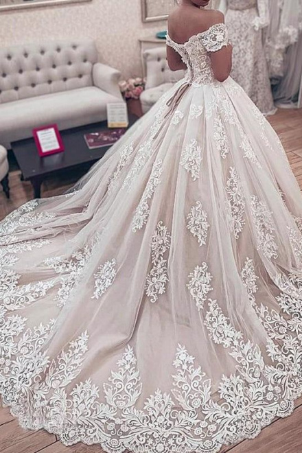 Ball Gown Wedding Dresses Off Shoulder Chapel Train Lace Tulle Short Sleeve Formal Luxurious with Appliques