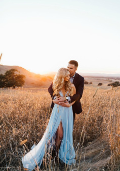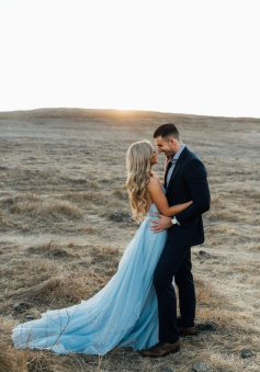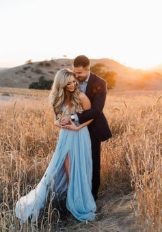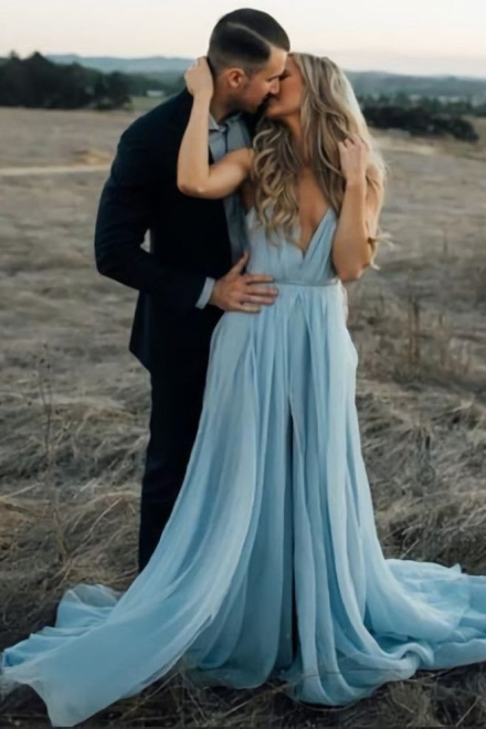 Sky Blue Chiffon Split Beach Wedding Dress With Court Train Prom Dresses